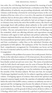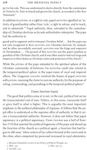 Greenaway then immediately quotes Oakeshott: “The Pope had authority to ‘guard and to augment and to interpret Christian belief…But the Pope was not only recognized to have auctoritas over Christian doctrine; he claimed, as he often successfully exercised, auctoritas over kings and emperors of Christendom…The ground of this auctoritas was the Pope’s position as guardian of the Christian Church; and it was often used to instruct kings and emperors in their duties as Christian rulers and protectors of the Church’” (ibid)